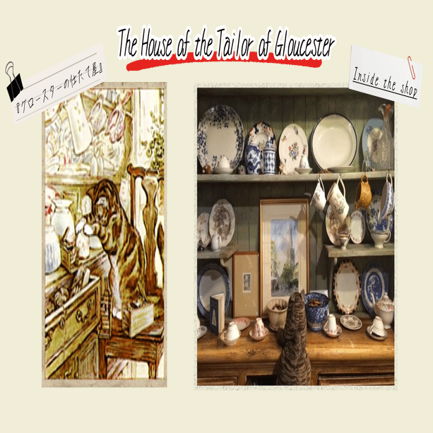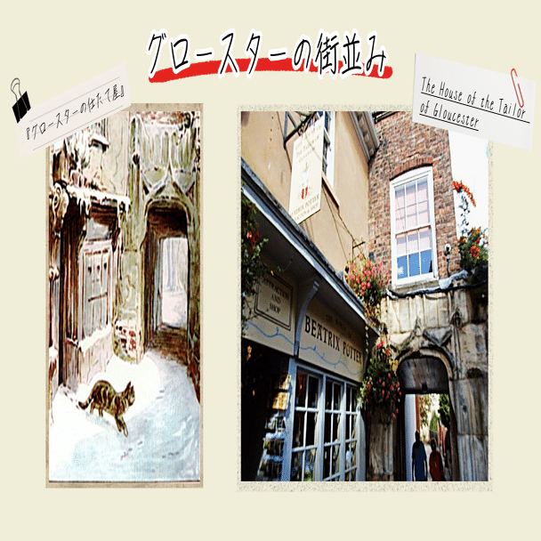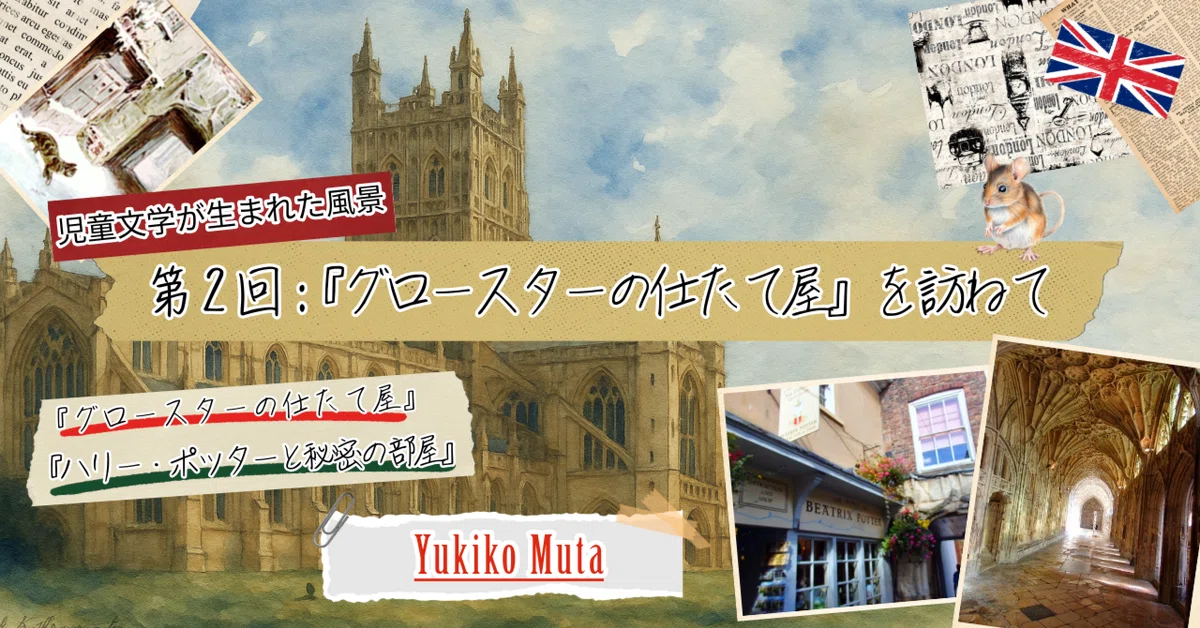 2025.06.13 著者のコラム 児童文学が生まれた風景:第2回『グロースターの仕たて屋』を訪ねて 著者 牟田有紀子(むたゆきこ) 目次1.はじめに2.『グロースターの仕たて屋』3.グロースターの街並み4.グロースターのもう一つの顔5. おわりに 1.はじめに ビアトリクス・ポター(Beatrix Potter)の名前を聞いて、まず思い浮かぶのは『ピーターラビットのおはなし』(The Tale of Peter Rabbit, 1902)と湖水地方の美しい自然ではないでしょうか。確かにポターの多くの作品は、緑豊かな丘や森、石垣に囲まれた農場など、イギリス北部の風景を舞台としています。ですが、その創作の舞台は決して湖水地方だけにとどまりません。イングランド西部の都市グロースターもまた、ポターにとって特別な意味を持つ場所です。 2.『グロースターの仕たて屋』 『グロースターの仕たて屋』(The Tailor of Gloucester)は、1903年に出版されました。ポターが「自分の作品の中で一番好き」と語った絵本です。この物語が生まれたきっかけは、ポターがグロースターを旅した際に耳にした、一人の仕たて屋にまつわるお話でした。クリスマスを間近に控えたある冬の日、体調を崩してしまった仕たて屋が仕上げることのできなかった上着を、夜の間に小さな妖精たちが完成させたというお話です。それを聞いたポターは、後にねずみを主人公にした『グロースターの仕たて屋』を書きました。 『グロースターの仕たて屋』の舞台は、石造りの古い家々が並ぶグロースターの街です。小さな仕たて屋が、クリスマスに行われる市長の婚礼用の上着を仕たてるという依頼を受けるところから始まります。仕たて屋はとても手の込んだ衣装の作成のために周到に準備をしたのですが、糸は足りなくなったり風邪をひいて寝込んでしまったりで完成の目途が立ちません。絶望する彼のもとに現れたのが、以前から店に出入りしていたねずみたちでした。夜のあいだにせっせと針仕事を続け、完璧な上着を仕上げてくれます。 3.グロースターの街並み (The House of the Tailor of Gloucester外観) この物語の魅力は、なんといってもポターが描いた挿絵の細やかさにあります。仕たて屋の部屋の様子、裁縫道具のひとつひとつ、ねずみたちが健気に針仕事をする姿、出来上がった服の柄など、どの挿絵にも当時の生活のディテールがちりばめられており、ポターのねずみへの深い愛が感じられます。そしてこれらの挿絵には、実際の街の建物や通りが丹念に描き込まれています。そのため読者は、絵本を読みながら「この建物、どこかで見たことがある」と感じることができます。 現在、グロースターには物語に登場する仕たて屋の店を再現した「The House of the Tailor of Gloucester」という小さな博物館兼ショップがあります。ここにある木のカウンター、棚に並んだ糸巻きや食器棚などは絵本の挿絵そのままで、物語の世界に入り込んだような気持ちになれます。周囲の通りにも物語に登場する風景が残っており、グロースターの街全体が一冊の絵本のようです。 (お店のディスプレイ) 4.グロースターのもう一つの顔 グロースターには、もうひとつの顔があります。それは、映画『ハリー・ポッター』シリーズとの関係です。街の中心にそびえるグロースター大聖堂は、第二作『ハリー・ポッターと秘密の部屋』の撮影に使用されたロケ地のひとつです。特に有名なのは、回廊の壁に「The Chamber of Secrets has been opened(秘密の部屋は開かれたり)」という血文字が現れる場面で、静まり返った回廊をハリーたちが緊張しながら歩く姿が印象的です。実際にその場所を訪れると、静かな回廊に身を置きながら、物語と現実が交錯するような感覚を味わえます。ポターが描いた小さなねずみたちの世界と、ローリングが描いた魔法使いたちの冒険譚というまったく異なる物語が、ひとつの街の中で響き合っています。 (グロースター大聖堂の回廊) 5. おわりに グロースターは、大きなテーマパークのような派手さはありません。だからこそ『グロースターの仕たて屋』の小さな愛おしい物語が生まれたのだと感じます。グロースターの街並みは、現実の世界のすぐ隣にひっそりと物語が存在していることを思い出させてくれます。ちなみに、日本でもビアトリクス・ポターの世界を体験できる場所があります。埼玉県にある「埼玉県こども動物自然公園」内には、湖水地方のヒルトップの家を忠実に再現したビアトリクス・ポター資料館があり、彼女の作品に登場する動物たちや暮らしの道具が展示されています。遠く離れた日本の地にも、ポターの作品に対する深い愛情が息づいていることを実感できる場所です。湖水地方やグロースターに行くのは簡単ではありませんが、埼玉県近郊の方はぜひ訪れてみてください。(埼玉県こども動物自然公園URL)https://www.parks.or.jp/sczoo/guide/000/000215.html 牟田有紀子(むたゆきこ)城西大学経営学部准教授。宮崎県宮崎市出身。早稲田大学文学部英文学コースを卒業後、同大学大学院文学研究