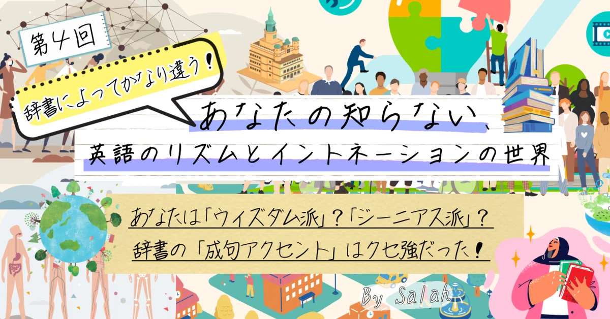 2025.07.25 著者のコラム 『あなたの知らない、英語のリズムとイントネーションの世界』第4回:成句アクセント編 著者 サラ あなたは「ウィズダム派」?「ジーニアス派」?:辞書の「成句アクセント」はクセ強だった! こんにちは、連載「あなたの知らない、英語のリズムとイントネーションの世界」を担当しているサラです。この連載もついにこの記事で最終回です。今回は、辞書の「成句アクセント」について。 単語レベルではアクセントはしっかり調べているという人も、成句についてはアクセントをほとんど調べていない、という人も多いのではないでしょうか?この記事で、辞書の「成句アクセント」に興味を持つ人が増えれば嬉しいなと思います。 句動詞とは この記事を読んでいる方なら、これまで英単語・熟語帳を1冊は使ったことがあると思います。そのときに、以下のようなフレーズを見かけたことはありませんか? ・stand out 「目立つ、際立つ」・let up 「雨などが止む」・go by 「時が過ぎる」・set in 「特によくないこと・悪天候・病気などが始まる」・put up with〜 「〜を我慢する」・come down with〜 「〜(風邪などの軽い病気)にかかる」・do away with〜 「〜を廃止する」 例えば、stand outは「目立つ、際立つ」という意味ですが、standという「動詞」と、outという「副詞」が結びついてできています。このように、基本的な動詞が副詞や前置詞などと結びつき、1つの動詞のような意味を持つものを「句動詞」(phrasal verb)と言います。「群動詞」(group verb)と呼ばれることもありますがこの記事では「句動詞」と呼びます。 日常のあらゆる場面で不可欠な句動詞 句動詞は日常のあらゆる場面で非常によく使われる動詞で、句動詞なしにスピーキング、特に会話表現を語ることはできません。母語話者は句動詞を好んで使うものの、学習者は使用を避ける傾向があると言われており、中田達也著『英語は決まり文句が8割』(講談社)では、句動詞がない言語を母語とする学習者(日本語母語話者も含む)の多くは句動詞を苦手としていることを指摘しています。 また、同書では母語話者が句動詞を好んで使う傾向について、一般的なテキストでは、約150語に1回の割合で句動詞が使用されているという推計があることを紹介しています。平均的な英語書籍は1ページあたり300語前後であるため、1ページに句動詞が2回出てくる計算です。ちなみに、英語の句動詞は非常に数が多く、その数は8,000に迫るという説もあるそうです。 多くの学習者が知らない「句動詞の読み方」 句動詞は、このように非常に重要なのですが、「どこを強く目立たせて読むか」という「アクセント位置」に関してほとんど気を配っていない学習者も見受けられる印象です。つまり、「句動詞の読み方」を知らない人も多いのです。 最も強く目立って読まれるのはどこ? 次の3つ句動詞は「どこが最も目立って強く読まれるか」を考えながら、声に出して読んでみましょう。なお、今日は「文レベル」でなく、辞書に載っているような「フレーズレベル」でアクセントを考えます。 1 put up with〜 「〜を我慢する」2 come down with〜 「〜(風邪などの軽い病気)にかかる」3 do away with〜 「〜を廃止する」 いかがでしょうか?簡単だと感じた人も、難しいと感じた人もいると思いますが、これまで句動詞を苦手に感じていた人もご安心ください。実は句動詞のアクセント位置は辞書で調べられるので、この記事で調べ方を簡単に紹介します。※1 ※1:句動詞はいくつかのパターンがあり、語順や使い方など注意すべきことが他にもたくさんありますが、この記事では割愛し、アクセントに絞ってお話しています。 「副詞」が最も強く目立って読まれる 上記3つは全て「動詞+副詞+前置詞」で構成されているタイプの句動詞で、私はこのタイプを「put UP with型」の句動詞と読んでいますが、「副詞」upが最も強く目立って読まれます。 ▼1〜3の音声(←音声はこちらから視聴可能です。) ▼1〜3の音声視聴URL ↓https://drive.google.com/file/d/16UwDnb_P6MaindMMlOgcmBuJ7dYHCItH/view 辞書でアクセントを確認 次に、辞書で実際にこれら3つの句動詞のアクセントを確認してみましょう。学習者向けの「英和辞典」や「英英辞典」の多くは句動詞のアクセントが表記されています。例えば、『ウィズダム英和辞典第4版』でput up with, come down with, do away withを引くと以下のように載っています。 1 pùt úp with A2 còme dówn with A3 dò awáy with A 第1アクセントは「́ 」で、第2アクセントは「 ` 」で示されています。最も目立って読まれるのが第1アクセントで、それぞれ「副詞」のup, down, -wayに第1アクセントがあるのが分かります。このように、句動詞のアクセントは辞書で簡単に確認することができますので、句動詞を調べるときは意味だけでなくアクセント位置まで必ず調べるようにしましょう。※2 ※2:アクセントは「強勢」ともいいますが、この記事ではアクセントと呼びます。 アクセント表記は辞書によって違うことがある