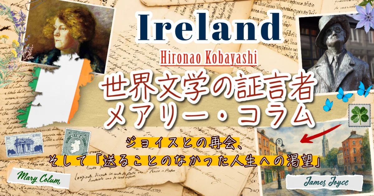 2025.09.26 NEW 著者のコラム 世界文学の証言者、メアリー・コラム:第4回 ジョイスとの再会、そして「送ることのなかった人生への渇望」 著者 小林広直 目次はじめに独立後のアイルランドへ、そしてロンドン、パリ、ハワイコラム夫妻のアメリカ滞在を追って②コネティカット→NYジョイスとコラムの共通点と相違点エルマンが描くジョイスとコラムが描くジョイス コラムの『ユリシーズ』への評価ジョイスの〈声〉おわりに はじめに メアリー・コラム『人生と夢と』(多田稔監訳、三神弘子・小林広直訳、幻戯書房、2025年)を紹介する本連載も、いよいよ第4回、最終回となりました。今回は表題にもあるようにジェイムズ・ジョイス(1882-1941)との「再会」について――1930年~1932年のパリを中心に――お話ししたいと思いますが[1]、その前に、前回の連載ではコラムのダブリン時代(第8章~第16章)にフォーカスをしましたので、その後のアメリカ時代を簡単に触れておきたいと思います。 コラム夫妻のアメリカ滞在を追って①ピッツバーク→NY→シカゴ→NY 本書の第17章から第32章までの目次は、下記のとおりです(場所については[]で補いました)。 第17章 出発 [ダブリン]第18章 アメリカでの最初の数週間 [ピッツバーグ]第19章 みすぼらしいビークマン・プレイスのアパート [ニューヨーク]第20章 シカゴ 一九一五年第21章 フランス人が営む下宿屋――アイルランドの反乱 [ニューヨーク]第22章 生活費を稼ぐ [ニューヨーク]第23章 詩人たち、そして彼らの葛藤第24章 アメリカで暮らす一人のフランス人作家第25章 アイルランドに帰る第26章 ロンドンのボヘミアン社会第27章 様変わりしたヨーロッパ [ロンドン→パリ]第28章 ハワイでの幕間第29章 エリノア・ワイリー [コネティカット]第30章 コネティカットでの仮住まい第31章 エリノア・ワイリーの死第32章 文芸批評家 コラム夫妻は第1次世界大戦(1914年7月~1918年11月)が始まって間もない、1914年8月にポーリックのおばが滞在するアメリカ、ピッツバーグに向かい、その後の主たる住まいはずっとアメリカにありました(メアリーは1957年にニューヨークで死去)。目次にもありますように、アメリカ国内でも様々に移動をしていることが見て取れます(この越境性や移動性の問題は世界文学との関連で後ほどお話します)。第18章ではニューヨークの港に到着し(「船旅はもちろん非常に不快なものだった」(262頁、以下太字の強調はすべて引用者)とありますが、やはり「もちろん」というコラムさんの〈毒舌〉が素敵です)、エリス島で種々の「検査」を受けたときの記述も非常に印象的ですが、最初の滞在地であるピッツバーグについて「おそらく、私の記憶は少しロマンティックで曖昧なものになっていると思う」と冷静な自己分析を行った上で、「あらゆることが非常に速い速度で進行すること、ダブリンで慣れていたゆったりした生活とは異なることに、私は驚かされた」(271頁)と書いています。この点は本連載第2回で書いた、アイルランドの田舎からダブリン、そしてアメリカへと、前近代的な田舎の生活から文芸復興運動に湧いていた首都、さらに近代化が進んだ都市と移動していることによる衝撃故であると分かります。まさにこの点は、「旅行記」としての本書の魅力、と言えそうですが、渡米後は、アイルランドとアメリカ(祖国と新天地)、あるいはヨーロッパとアメリカ(旧世界と新世界)の比較が様々な点から成されますので、その意味では「文化的資料」としての読み応えも充分にあるかと思います(文学の受け止められ方の違い――アメリカはやはり当時から実学志向が強かったようです――はもちろんですが、職場での自己主張の仕方、女性の社会的役割などの〈常識〉の違いは非常に示唆に富んでいます)。 アメリカでの出会い、「交友録」という側面では、有名人を中心にピックアップいたしますと(ミーハーですみません…)、第18章では(ピッツバーグ)ウィラ・キャザー、第19章では(マンハッタン、ビークマン・プレイス)ヴェイチェル・リンゼイ、J・B・イェイツ(詩人W・Bの父)、エリノア・ワイリーやジョン・クイン、第20章では(シカゴ[2])ハリエット・モンロー[3]、エドガー・リー・マスターズ、シャーウッド・アンダーソン、第21章では(マンハッタンの下宿屋)レオン・トロツキー[4]、第22章では(マンハッタン、賃貸アパート)ポール・ポワレ、イヴェット・ギルベール、リヒャルト・シュトラウス、アルバート・アインシュタイン、ロバート・フロスト、エイミー・ローウェル、エラー・ウィラー・ウィルコックスなどの名前が登場します。 時系列順の記述はいったんここで終わり、「詩人たち、そして彼らの葛藤」と題された第23章では、のちに自ら命を絶つことになる若い詩人たち、ハート・クレイン、そしてグラディスとドロシア・クロムウェル姉妹が中心的に描かれます(特に後者の双子姉妹については、やはり第一次世界大戦でのPTSD(当時はshellshock)との関連が指摘できそう
