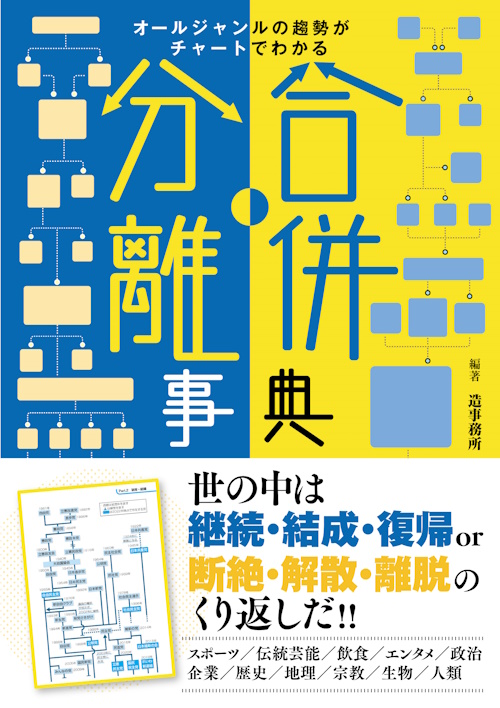 今回ご紹介する『合併・分離事典』は、前述の徳川幕府の系譜のように、時代の経過とともに変遷する物事をチャート化し、視覚的にイメージすることができる一冊です。