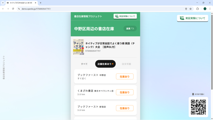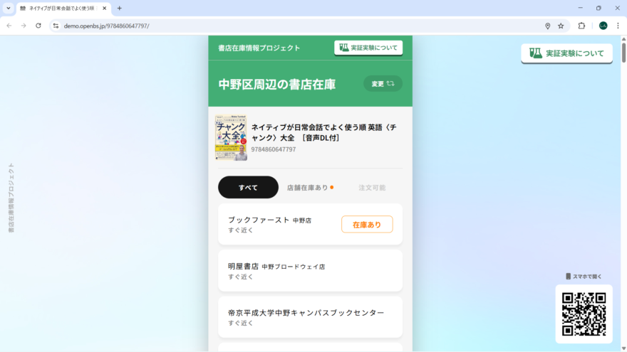 こちらは、一般財団法人 出版文化産業振興財団(JPIC)と株式会社カーリル及び一般社団法人版元ドットコムによって実施している「書店在庫情報プロジェクト」で開発中のシステムを利用したものです。